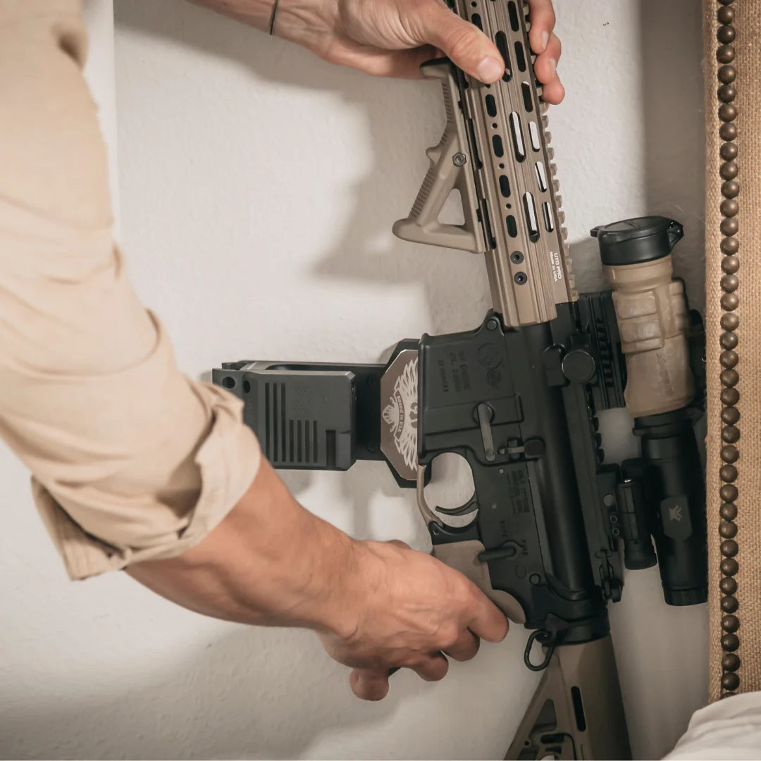 You can mount it on almost any flat, solid surface—walls, modular panels, wood furniture, inside closets, behind doors or even on your truck. Just make sure the surface is stable enough to support your rifle, and you’re good to go. It’s perfect for gun rooms, hallways, bedrooms, or anywhere quick access matters.